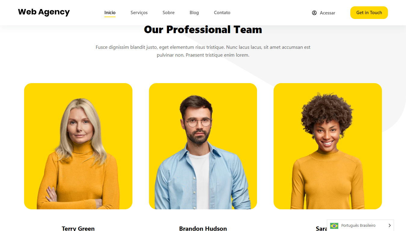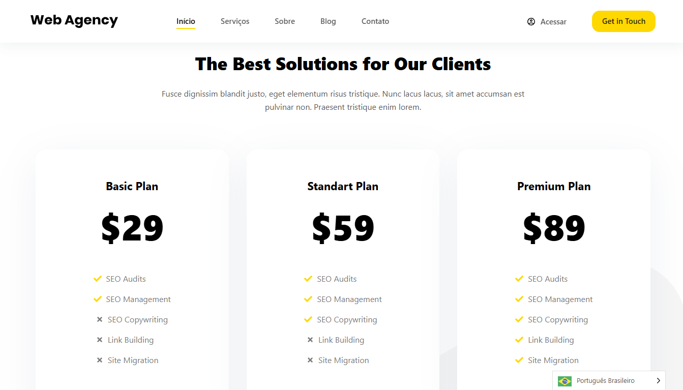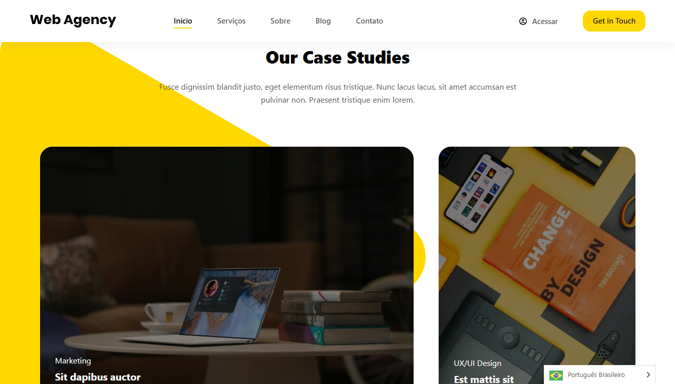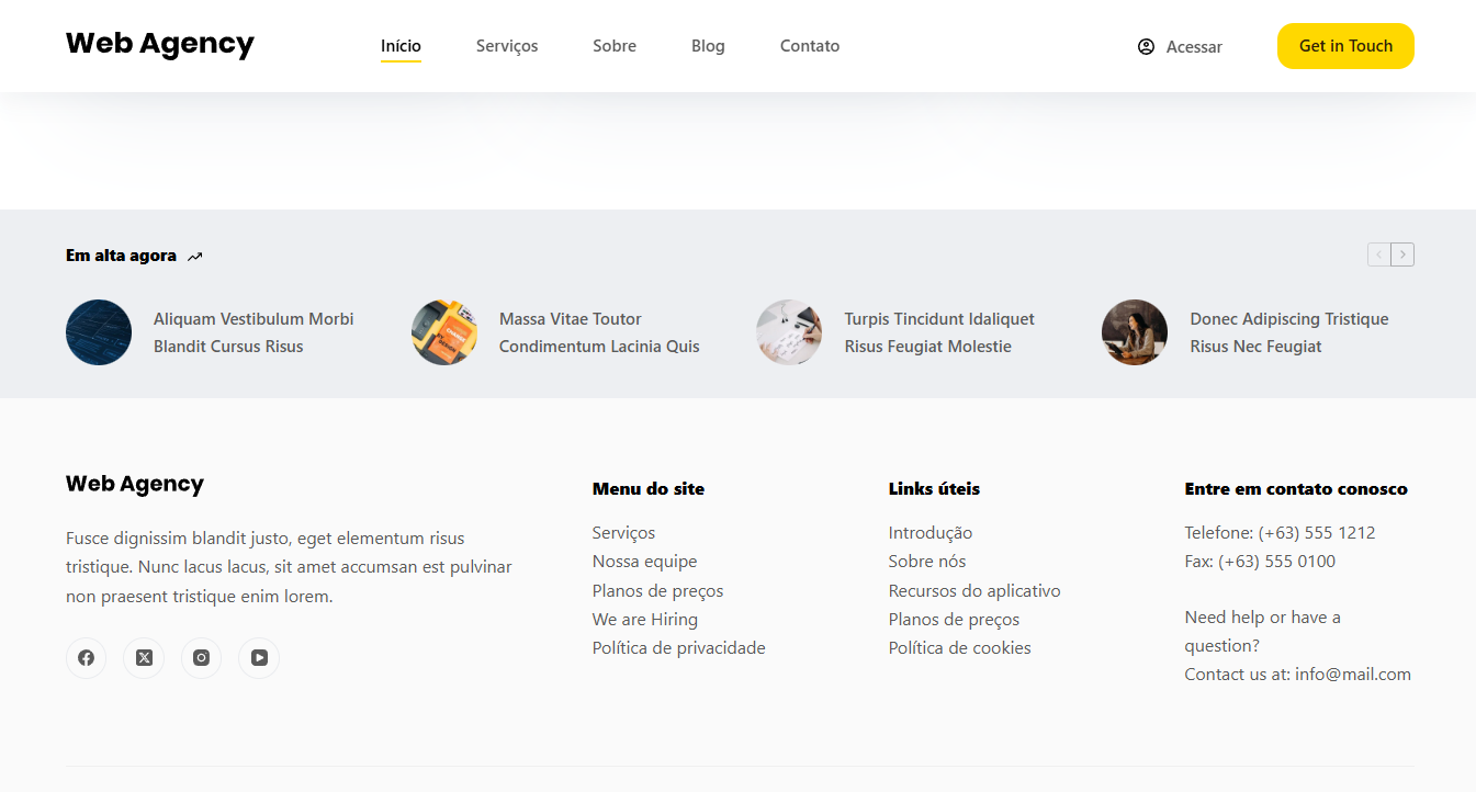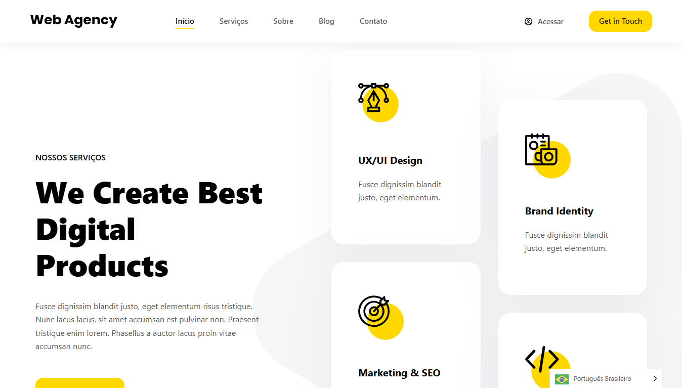 Este template para Agência de Marketing é moderno e dinâmico, ideal para destacar serviços, cases de sucesso e equipe. Com um design estratégico e intuitivo, ele facilita a captação de clientes e a apresentação de soluções criativas. Perfeito para agências que desejam uma presença online profissional e impactante.