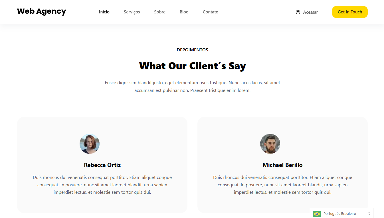 Este template para Agência de Marketing é moderno e dinâmico, ideal para destacar serviços, cases de sucesso e equipe. Com um design estratégico e intuitivo, ele facilita a captação de clientes e a apresentação de soluções criativas. Perfeito para agências que desejam uma presença online profissional e impactante.
